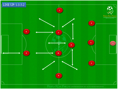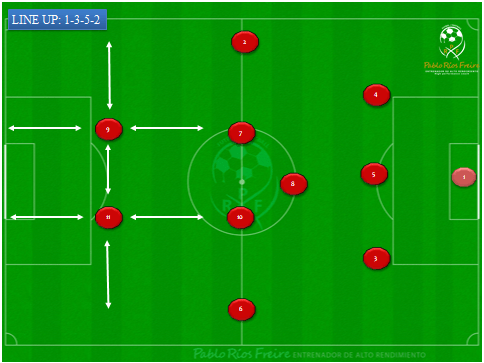 Dentro de mi filosofía el 1-3-5-2 es el sistema de juego que más me gusta trabajar y poner en práctica y con el que más disfruto, pero el que menos uso debido a su complejidad y a las características de los jugadores por puesto, ya que son muy difíciles de encontrar o adaptarse al sistema. El sistema se divide en 4 líneas con diferentes jugadores por línea con lo que el equipo en la fase defensiva, tiene un desgaste elevado por los laterales pero muy equilibrado por el centro y en la fase ofensiva laterales carrileros muy altos para dar amplitud de juego y muchos jugadores en zona de remate.