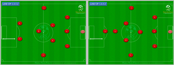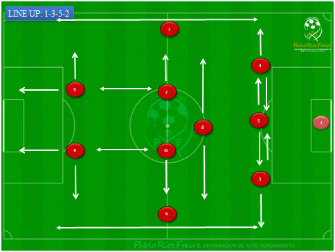Dentro del sistema 1-3-5-2 podemos realizar diferentes variantes, colocando a los 3 centrocampistas en triángulo con punta ofensiva o dejando a 1 delantero de media punta de enlace.