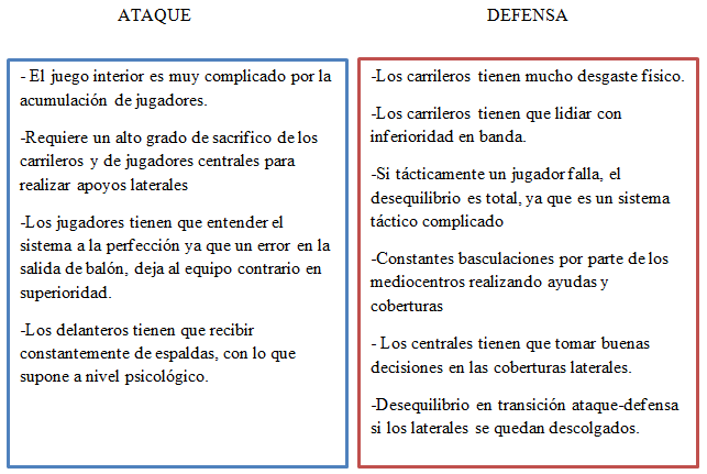 Después del desglose del sistema de juego podemos observar que es un sistema táctico complejo ya que en transiciones ataque-defensa se producen muchos desajustes defensivos donde jugadores de diferentes posiciones tienen que corregir.