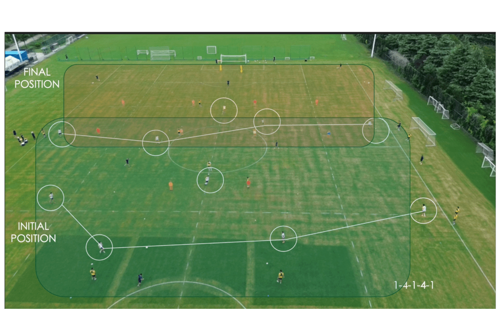 Con este tipo de ejercicio queremos mejorar y dar forma al ataque con un posicionamiento inicial, en este caso en 1-4-1-4-1 más la evolución con movimientos específicos de jugadores, dando como puntos clave el espacio entre ellos, la evolución del balón y de los jugadores tomando como referencia el balón (posicionamiento final), introduciendo en el ejercicio el componente físico de resistencia aeróbica y componentes psicológicos de espacio y tiempo.
