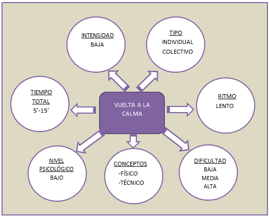 El objetivo final del entrenamiento es devolver al cuerpo a su estado de reposo inicial, para ello utilizamos juegos o ejercicios de intensidad muy baja o simplemente estiramientos pasivos o activos.