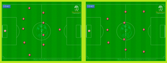 Sistemas de juego de amplitud. (Con la intención de hacer el campo más amplio y crear ventajas en espacios exteriores) 1-5-4-1 / 1-3-4-3/